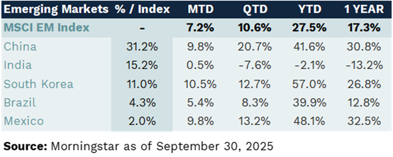 September saw a meaningful expansion in market leadership, with emerging markets and U.S. small-cap equities stepping into the spotlight. The MSCI Emerging Markets Index posted a 7.15% gain for the month, outpacing developed peers and marking its ninth consecutive monthly advance. Strength was concentrated in China, Brazil, Mexico, and South Korea where improving investor sentiment, favorable currency dynamics, and supportive policy environments helped drive returns. The rally was not limited to headline indices—growth-oriented segments within EM led performance, with technology and consumer discretionary sectors delivering outsized gains. This rotation suggests investors are increasingly willing to re-engage with regions that had previously lagged, reflecting a more constructive global risk appetite.