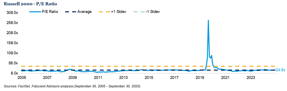 In the U.S., small-cap equities also staged a notable comeback. The Russell 2000 Index rose 3.11% in September, benefiting from the Federal Reserve’s rate cut and a more favorable macro backdrop for domestically focused companies. While large-cap growth has dominated year-to-date performance, the recent strength in small caps points to a broadening of participation and a potential shift in investor preference. Lower borrowing costs, improving labor market dynamics, and resilient consumer demand all contributed to the rebound. Importantly, the rally was accompanied by expanding market breadth and declining volatility, reinforcing the view that equity markets are transitioning from narrow leadership to a more inclusive phase. As of September 30, the Russell 2000 traded at 24.8x (or "times") forward earnings, aligning closely with its long-term average and suggesting valuations remain reasonable despite the recent rally.